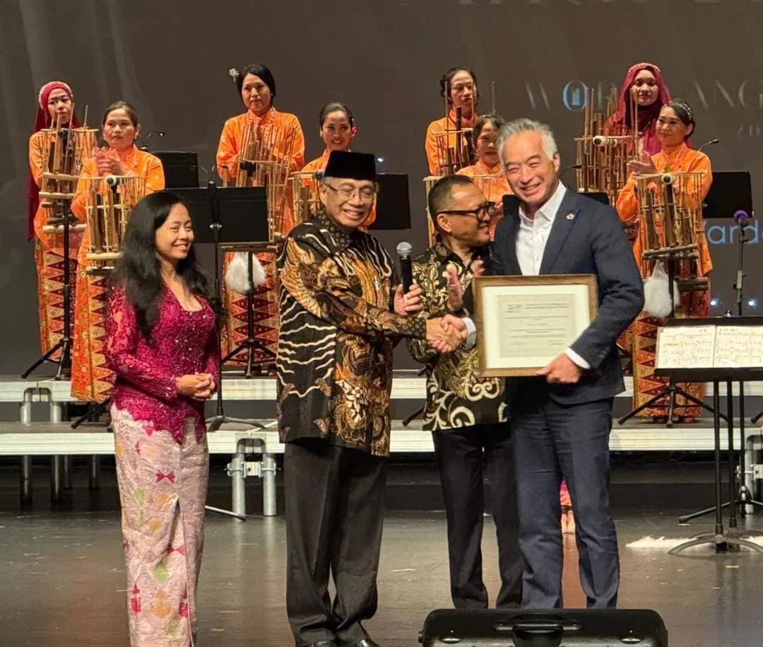 Millbrae, CA — Walikota Millbrae, Andres Fung, menerima Duplikat Sertifikat UNESCO Angklung Sebagai Warisan Dunia dari Duta Besar RI untuk Amerika Serikat, Indroyono Soesilo, didampingi Konsul Jenderal RI di San Francisco, Yohpy Ichsan Wardhana dan Presiden Indonesia Lighthouse, Ari Sufiati, 15 November 2025.