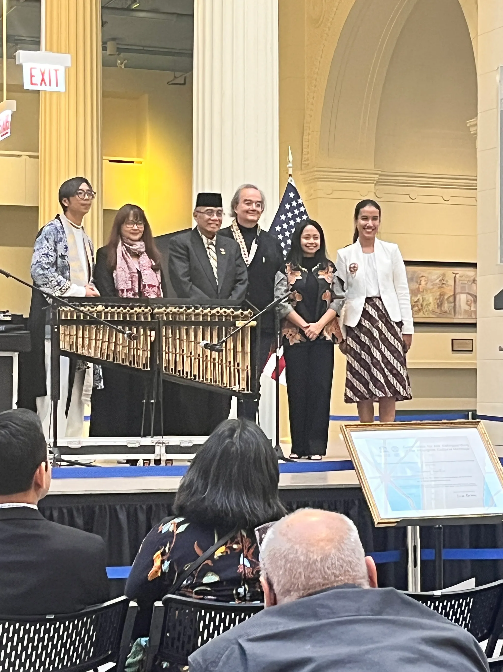 Chicago, CA — World Angklung Day di Field Museum. Dari kiri ke kanan: Manshur Angklung, Konsul Jenderal RI di Chicago, Trisari Dyah Paramita, Duta Besar RI untuk Amerika Serikat, Indroyono Soesilo, Head of Exhibitions at the Field Museum, Jaap Hoogstraten, Presiden Indonesia Lighthouse, Ari Sufiati dan staff KJRI di Chicago, Citra Fatihah, November 16, 2025
